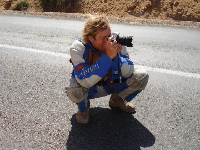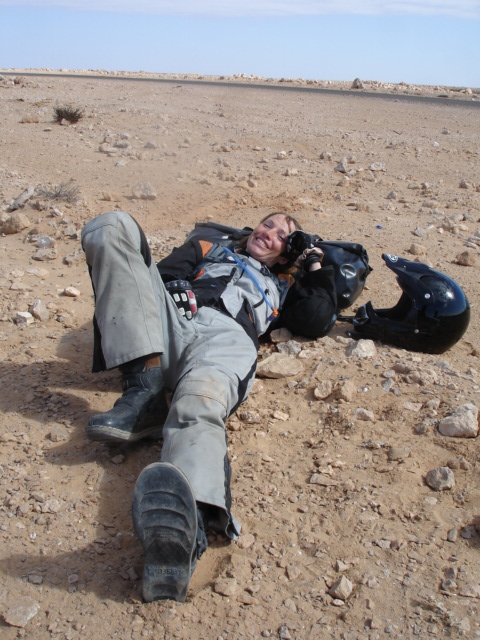 Nachdem ich gestern einen erfolgreichen Tag auf einem Stückchen Piste hatte ohne mich hinzu legen, denke ich mir so heute 'steigere ich das Ganze doch nochmal um ein paar Schwierigkeitsstufen ...' , nämlich weicher Sand mit grossen Steinen. Das geht natürlich voll in die Hose (Achtung Anfänger: nicht wie ich dann auch noch am Gasgriff festhalten und Beine weg vom Motorrad ...). Nachdem Amy und Rob (Chris war schon vorgefahren, um die Lage zu checken ...) mich dann von meinem Motorrad befreien, da nämlich Knie und Fuß dumm verdreht unter Motorrad eingeklemmt und Chris auf seine fachmännische, charmante und grobe Art mein Knie in alle Richtungen verbiegt und der Schmerz in meinem Knie langsam nachlässt, kann ich auch wieder lachen, da Bein zum Glück nicht gebrochen...