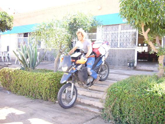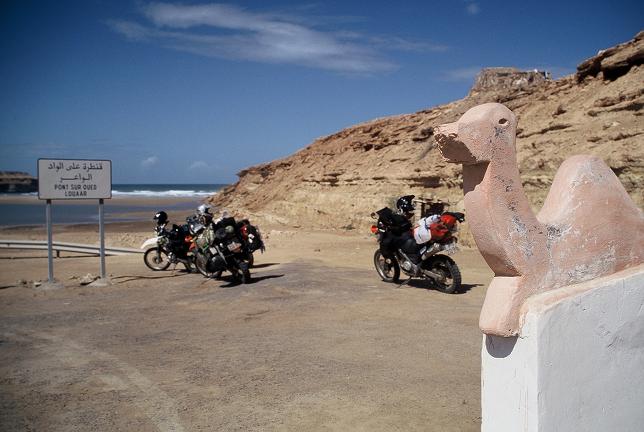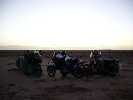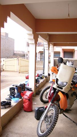 Wir irren dann noch etwas ziellos in Tan Tan herum auf der Suche nach einem Campingplatz (den es hier nicht gibt ...), treffen auch wieder die steinwerfenden Kinder (Der Tip aus dem Internet wirkt, beim vorbeifahren tiiiiieeef in die Augen schauen, dann lassen sie ihr Vorhaben), picken nebenbei noch einen nassen Belgier auf einer Yamaha XT auf (ebenfalls auf der Suche ...) und fahren weiter nach Tan Tan Plage. Dort fallen wir wie immer ... in das nächste Hotel. Unsere Motorräder werden dann sicherheitshalber auch im Hotel untergebracht. Dort stehen bereits zwei Motorräder und wie sich herausstellt haben sich hier wohl gerade alle Europäer der Umgebung vor dem Unwetter in Sicherheit gebracht. Hier lernen wir dann die Besitzer der anderen Motorräder kennen, Amy und Rob, ein australisches Pärchen.