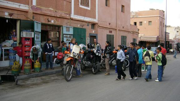 In Tarfaya gehen Amy und ich noch schnell einige Lebensmittel kaufen, in der Zwischenzeit bewachen Rob und Chris unsere Motorräder.
