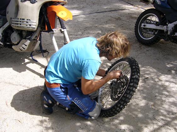 Während Rob den Schlauch seines platten Vorderreifens wechselt, packt Chris unsere Motorräder und unsere Sachen trocknen noch etwas in der Sonne ...