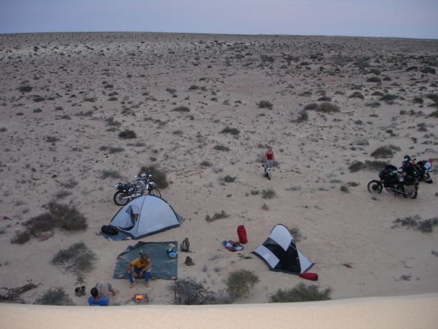 Unsere Zelte bauen wir direkt an einer etwa 20 Meter hohen Düne auf und verbringen den weiteren Abend gemütlich am Lagerfeuer.
