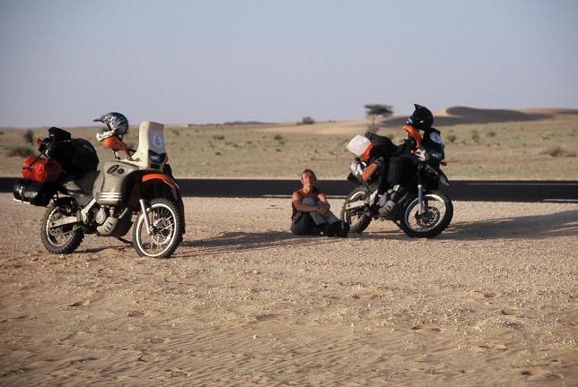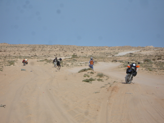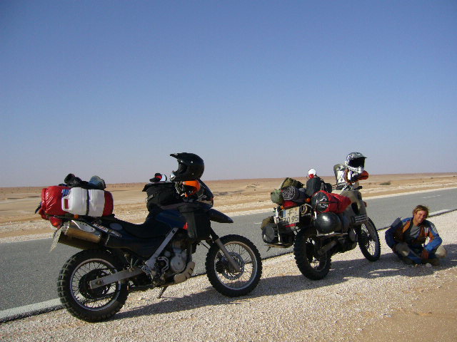 Nach einer etwas schmerzhaften Nacht (mein Bein ist nun etwas dicker als das Andere) und der erfolgreichen Geldübergabe von Western Union brechen alle nach und nach auf. Wir trennen uns von Amy und Rob, beide fahren mit Kati und Blair weiter über die Piste nach Choum. Wir haben beschlossen erstmal nach Nokachott, der Hauptstadt Mauretaniens zu fahren, da Piste für mich momentan unmöglich ist. Außerdem sind wir mittlerweile leider auch zu der Erkenntnis gekommen, dass unsere BMW,s F650 GS bzw. GS Dakar für diese Art zu reisen (vor allem auch noch mit Gepäck) NICHT geeignet sind. Sie sind einfach (mit Gepäck 220 Kg bzw. 300 Kg) zu schwer. Chris kann zwar seine noch halten, aber so richtig Spaß kommt dabei auch nicht auf. Ich bin wirklich neidisch auf Amy's 100 Kg leichtere Honda. Wenn ich mich hinlegte, hüpfte sie mit ihrer so locker flockig an mir vorbei...