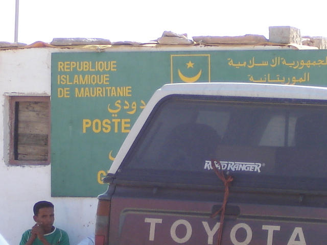 Nach 80 Km kommen wir zur Marokkanischen Grenze. Dort stehen bereits zahlreiche Fahrzeuge in einer Schlange und warten auf ihre Abfertigung. Wir müssen lachen, denn in Robs Reiseführer steht, das die Zeiten der langen Warteschlangen vorbei sind ... also fahren wir frech an allen vorbei und werden auch gleich bis zum Anfang durch gewunken. Nach 45 Minuten haben wir unseren Ausreisestempel, verlassen Marokko und plötzlich hört die Strasse auf. Ich denke nur 'das ist jetzt nicht wahr ...' , denn ich gehe davon aus, das das der allgemeine Straßenzustand in Mauretanien ist (zum Glück ist die nicht vorhandene Straße aber dann doch nur 1,5 Km lang).