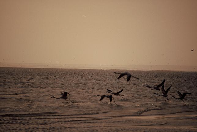 Bei Ebbe kann ich sogar ein Grüppchen von 9 Flamingos beobachten, die hier auf Futtersuche sind.