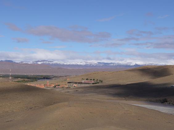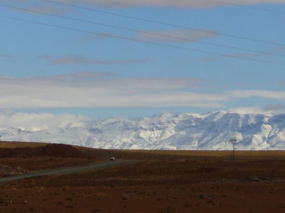 verschneite Berge des Atlasgebirges..., ich lach mich kaputt und sage zu Chris ´da müssen wir jetzt NICHT durch ...´ Doch müssen wir ... also trinken wir noch einen heißen Tee, knöpfen unsere Jacken (die ja für den Hochsommer gedacht waren) bis oben hin zu, verschließen alle Löcher in die es rein ziehen könnte und fahren los.